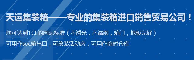 青島天運(yùn)集裝箱服務(wù)有限公司,是專業(yè)的集裝箱進(jìn)口銷售貿(mào)易公司,公司與各大船公司租箱公司保持著密切的合作關(guān)系,箱源充足,所有出售集裝箱均可達(dá)到IICL的國際標(biāo)準(zhǔn)(不透光,不漏雨,箱門,地板完好)可用作soc箱出口,可改裝活動(dòng)房,可用作臨時(shí)倉庫。